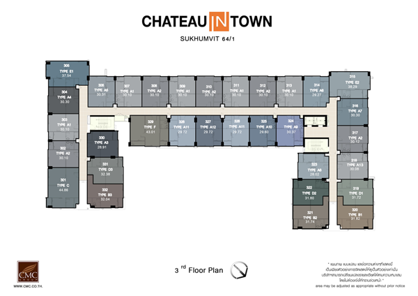 ชั้น 3-8 : จะคล้ายกันคือเป็นห้องพักอาศัยทั้งหมด มีห้องพักอาศัย 32 ยูนิต/ชั้น แบ่งเป็นห้อง 1 Bedroom 31 ยูนิต และห้องแบบ 2 Bedrooms อีก 1 ยูนิต