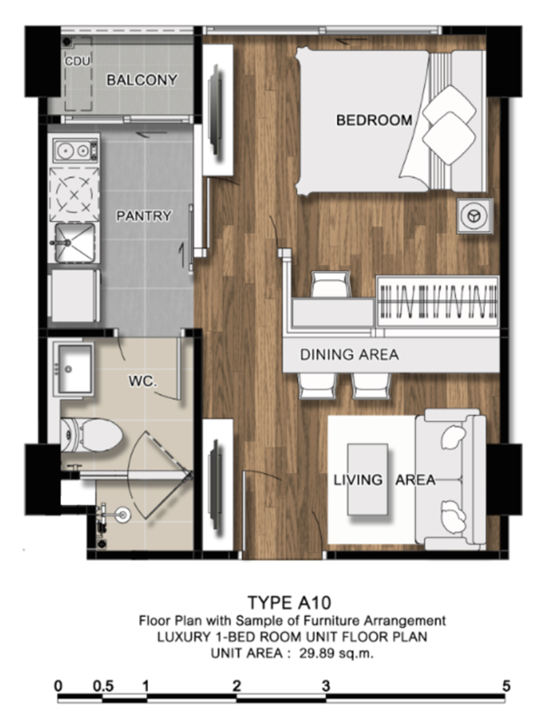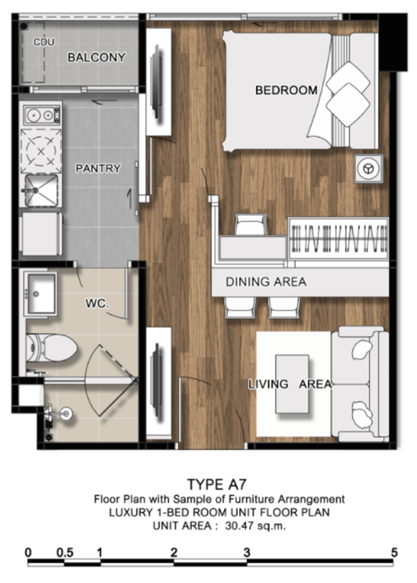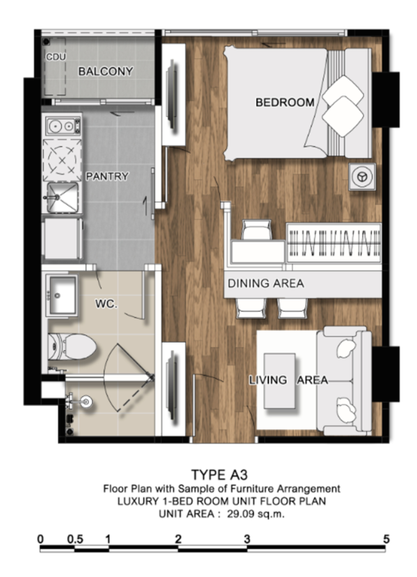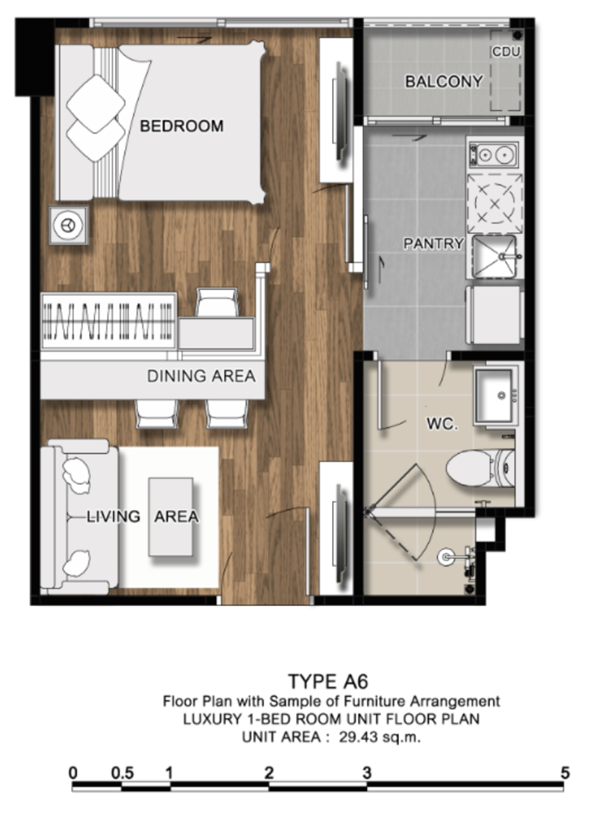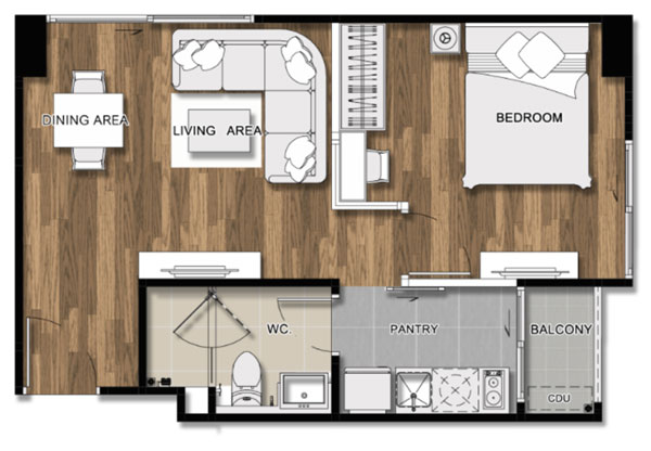 ภาพห้องตัวอย่างแบบ 1 ห้องนอน ขนาด 29.27 ตร.ม.