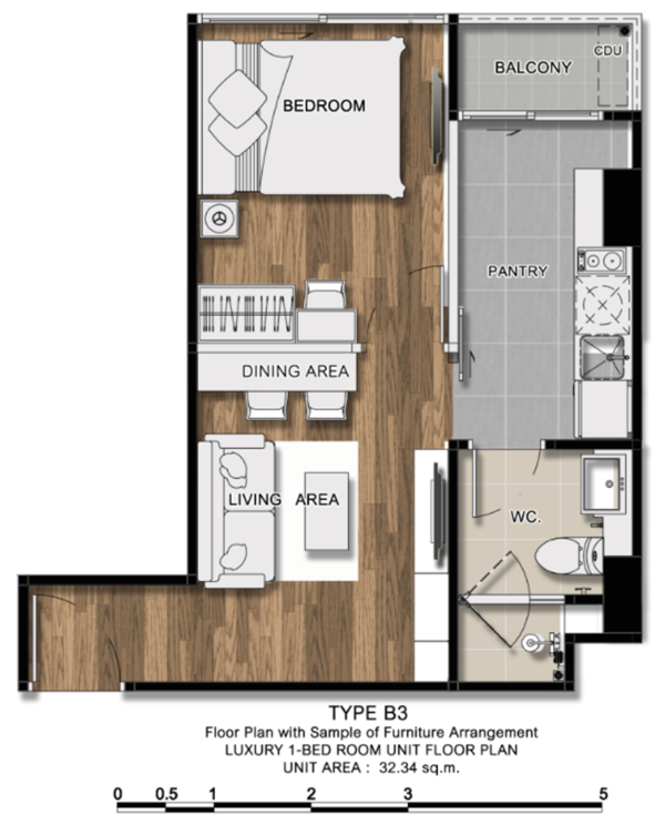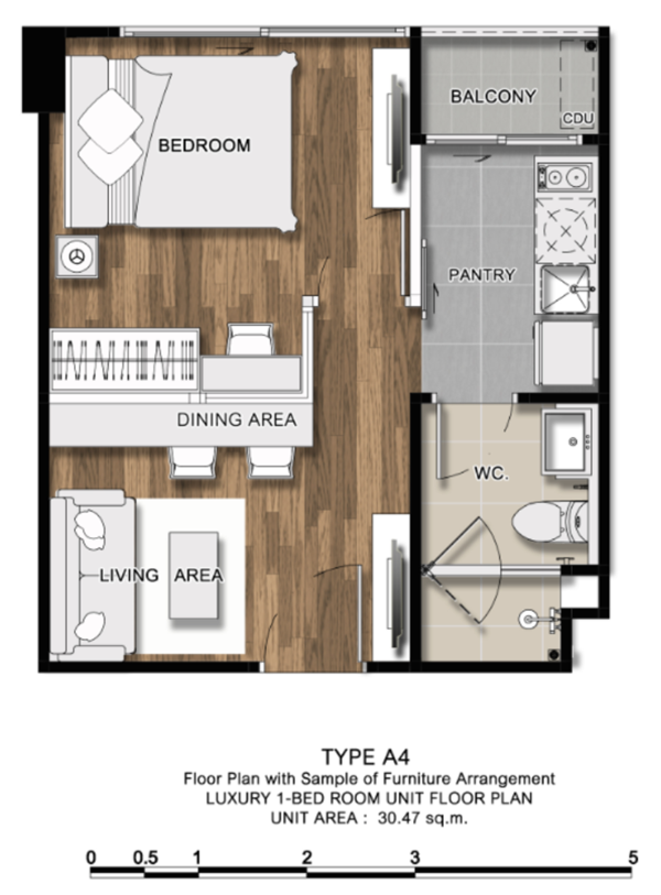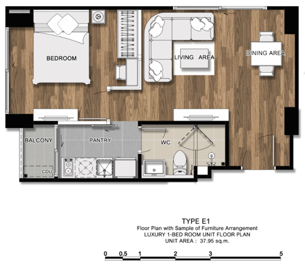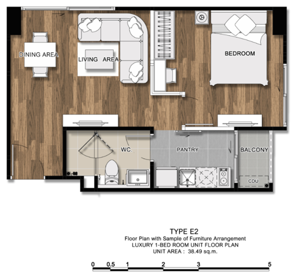 ภาพห้องตัวอย่างแบบ 1 ห้องนอน ขนาด 38.29 ตร.ม.