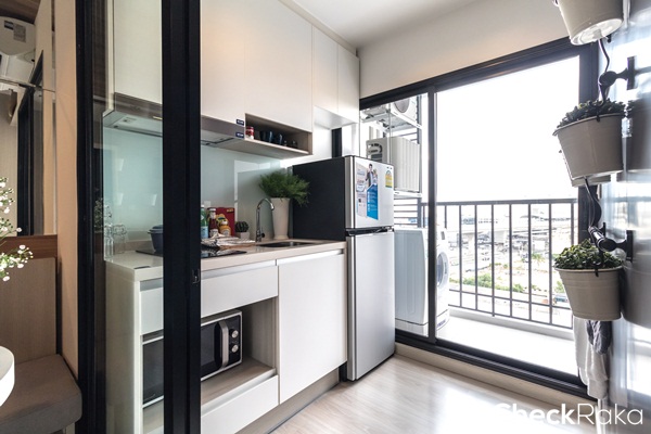 ห้องนี้ได้ครัว Built-in แบบเปิด ได้ชุดครัวของ Starmark พร้อมเครื่องดูควัน เตาไฟฟ้า อ่างล้างจาน ยกเว้นไมโครเวฟ