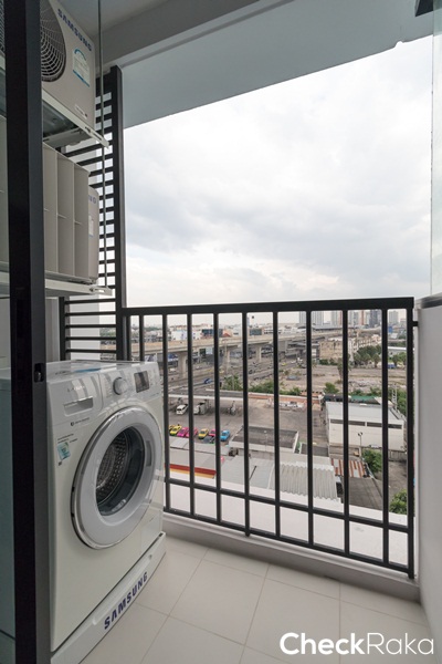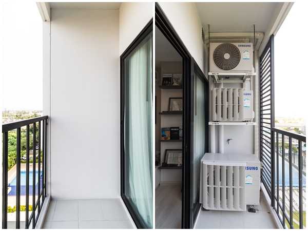 คอมเพรสเซอร์แอร์แขวนไว้ด้านข้าง แนะนำให้ติดกริลเพิ่มเป่าลมร้อนออกนอกระเบียง จะช่วยลดความร้อนที่ระเบียงได้ดี