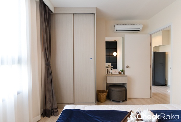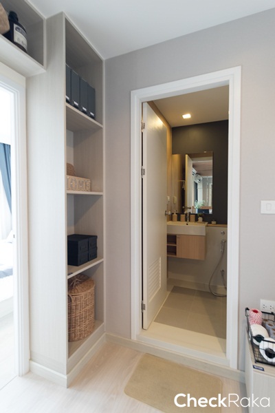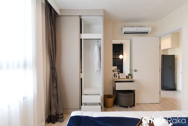 ห้องนี้จะได้ตู้เสื้อผ้า Built-in แบบบานเปิดขนาดพอๆ กับห้องที่แล้ว ด้านข้างได้โต๊ะเครื่องแป้ง Built-in ติดผนัง