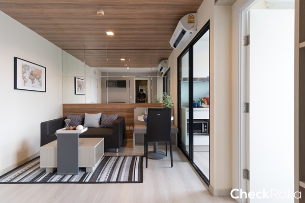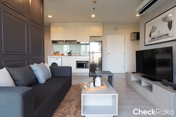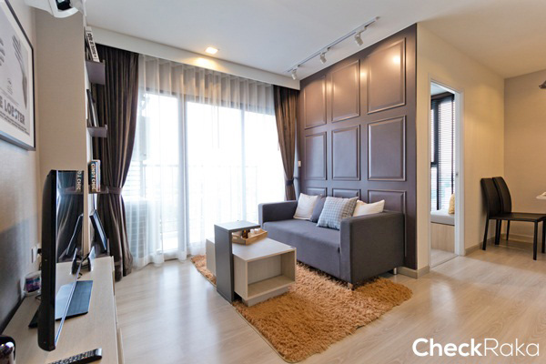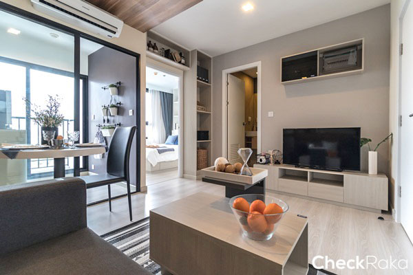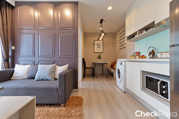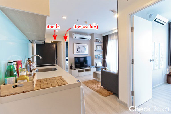 ห้องนี้ออกแบบฟังก์ชั่นเป็นครัวปิด สามารถทำอาหารได้ไม่รบกวนด้านนอก ห้องน้ำก็จะอยู่ด้านนอก แขกไปใครมาไม่ต้องผ่านเข้าไปในห้องนอนไม่รบกวนความเป็นส่วนตัว ห้องนั่งเล่นพื้นที่ใช้สอยกว้าง ระยะห่างระหว่างโซฟากับทีวีค่อนข้างไกล ส่วนเฟอร์นิเจอร์ที่ได้ประกอบด้วย