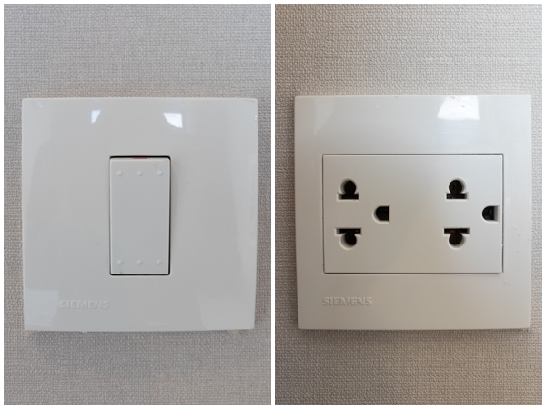 ปลั๊ก และสวิตซ์ไฟสีขาวภายในห้องเป็นของแบรนด์ SIEMENS