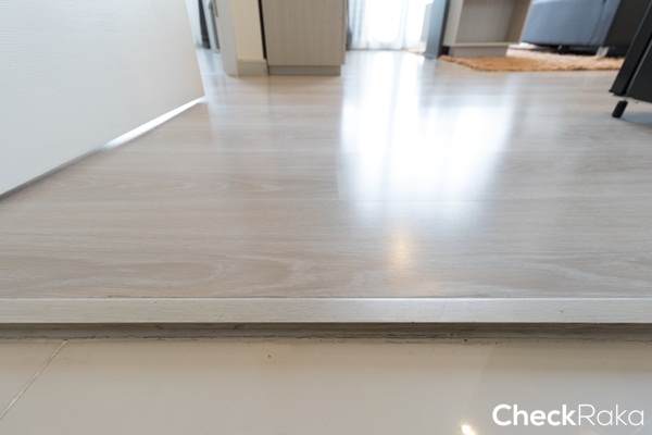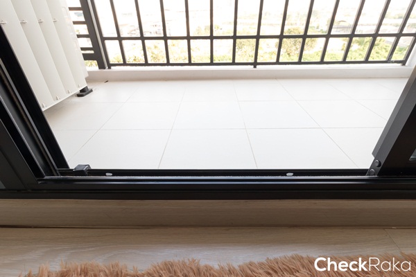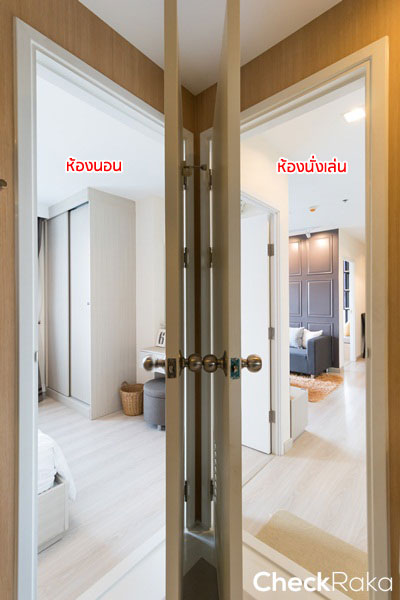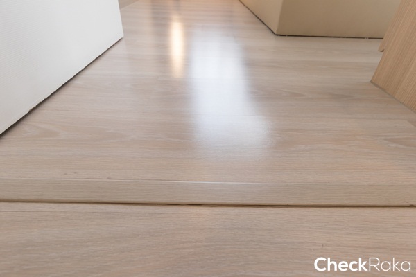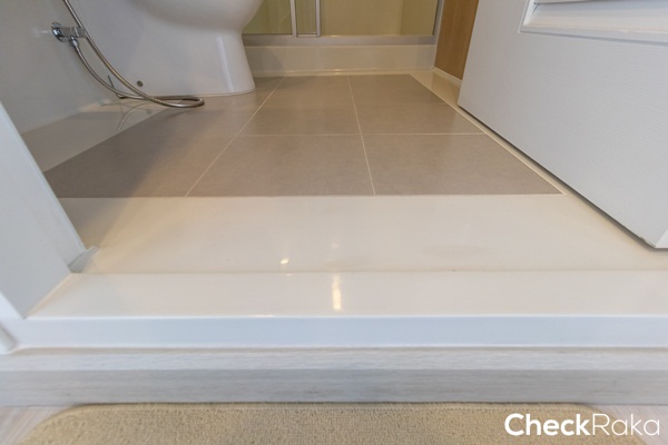 ธรณีห้องยกสูงจากโถงทางเดินประมาณ 2 ซม. จบประตูด้วยลามิเนตสีเดียวกับพื้นห้องช่วยกันแมลง และฝุ่น