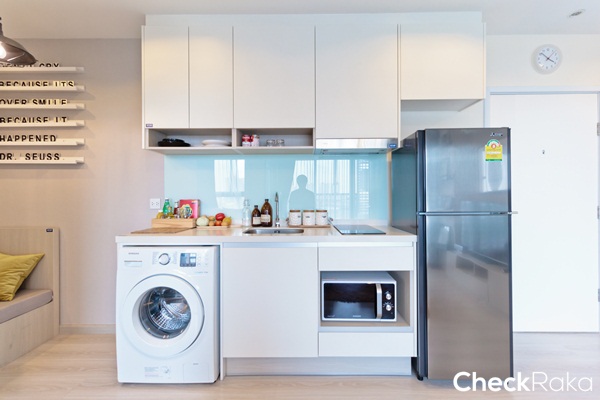 ได้ชุดครัวขนาดเล็กลงมาหน่อย แต่ยังคงได้เครื่องดูควัน เตาไฟฟ้า อ่างล้างจาน เหมือนเดิม