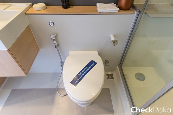 เป็นห้องน้ำแบบสำเร็จรูปแบรนด์ Aidol cube ในเครือ Mogen ข้อดีตรงที่ไม่มีรอยต่อ ลดปัญหาเรื่องการรั่วซึม ดูแลรักษาง่าย
