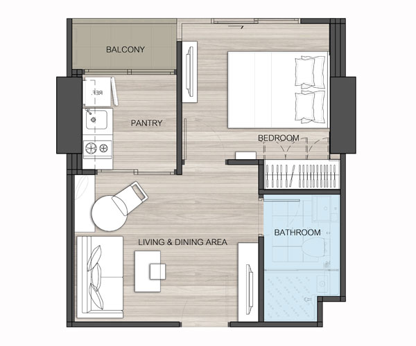 ตู้เสื้อผ้า กระจกเงา พร้อมชั้นวาง เตียงนอนขนาด 5 ฟุต ชั้นวางของรูปตัวแอล โซฟาขนาด 2 ที่นั่ง (ไม่รวมหมอนอิง) โต๊ะกลาง ตู้วางทีวี โต๊ะรับประทานอาหาร เก้าอี้ 1 ตัว เก้าอี้นั่งยาว 1 ตัว Lay out ห้อง Type B แบบ 1 ห้องนอน 1 ห้องน้ำ ขนาด 31.00 ตร.ม.