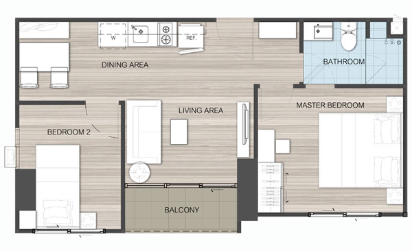 ห้องตัวอย่างแบบ 2 ห้องนอน Type D ขนาด 44.00 ตร.ม.