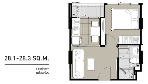 เนื้อที่ 28.29 ตร.ม. เหมือนกัน แต่จะเป็นแบบครัวเปิด และห้องน้ำอยู่ในห้องนอน