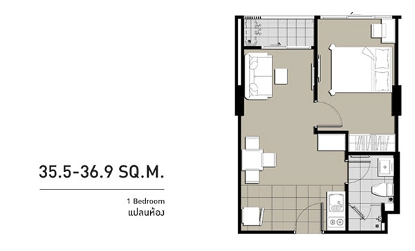 Layout ห้องนี้เป็นห้องหน้าแคบแนวลึกแบบ 1 ห้องนอน, 1 ห้องน้ำ, 1 ห้องครัว