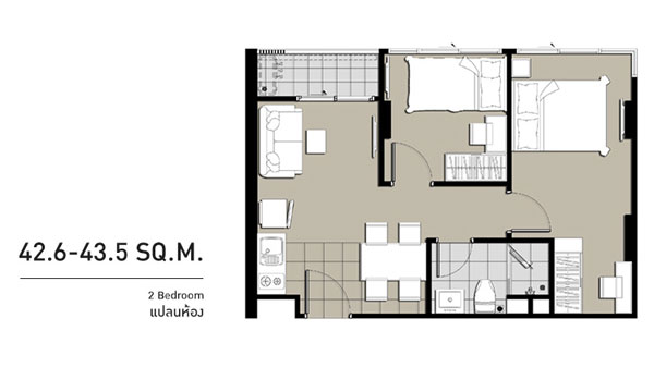 Layout นี้ จะเป็นห้องหน้ากว้างแบบ 2 ห้องนอน, 1 ห้องน้ำ, 1 ห้องครัว เนื้อที่ประมาณ 43 ตร.ม.
