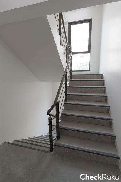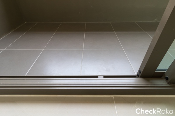 ยกธรณีสูงประมาณ 5 ซม. พื้นระเบียงปูด้วยกระเบื้องเซรามิกสีเทา ขนาด 30 x 30 ซม.