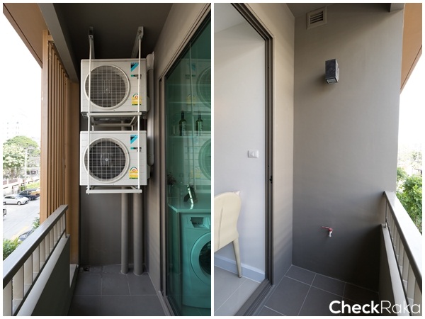ที่ระเบียงติดไฟที่ผนังมาให้ 1 ดวง พร้อมติดกริลล์บังสายตาบริเวณด้านข้างคอมเพรสเซอร์แอร์