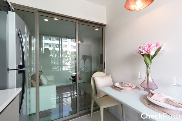 ห้องนี้วางโต๊ะทานข้าวแบบ 2 ที่นั่ง ไว้ในครัว ทำให้เหลือระยะทำครัวประมาณ 85 ซม.