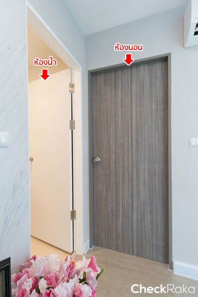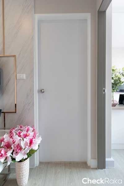 ที่ห้องนอนเป็นประตูสำเร็จรูป HDF กรุลามิเนต มือจับลูกบิดกลม