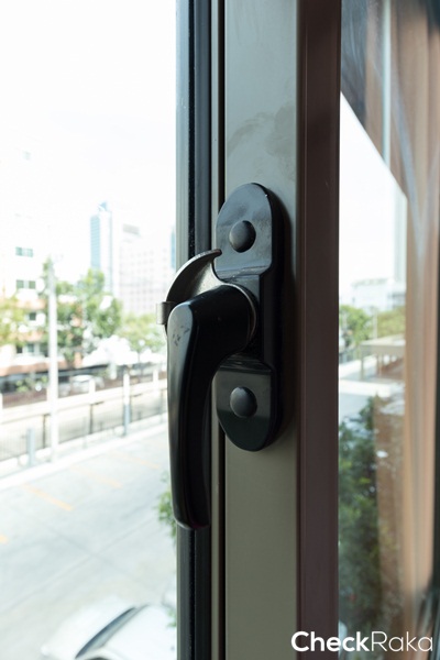 ได้หน้าต่างบานใหญ่ด้านบนแบบบานเลื่อน ด้านล่างแบบบานติดตาย กรอบอลูมิเนียมสีธรรมชาติเป็นกระจกเขียวตัดแสง ข้อดีของกระจกบานใหญ่คือแสงเข้าได้ดีทำให้ห้องดูสว่าง