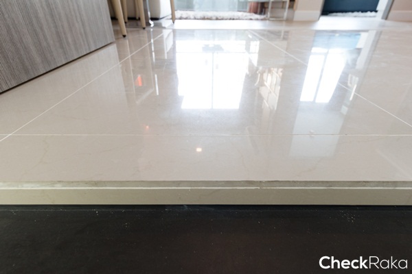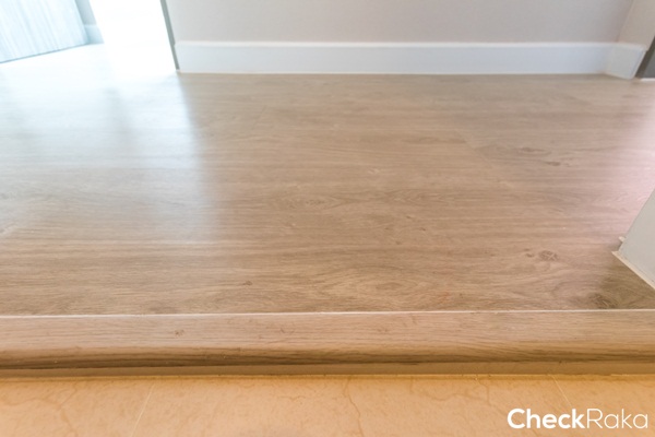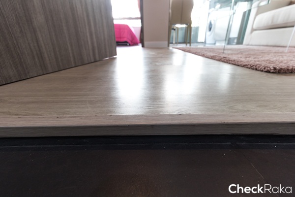 ระหว่างพื้นห้องครัวกับพื้นโซนห้องนั่งเล่นจะจบด้วยลามิเนตลายไม้สีเดียวกับพื้นสูงประมาณ 2 ซม.
