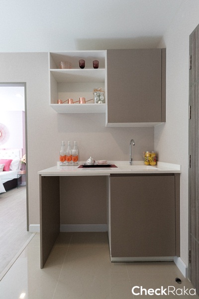 เข้ามาทางขวาเป็นโซนห้องครัวแบบเปิด เหมาะสำหรับทำอาหารแบบเบาๆ กลิ่นไม่ฉุนมาก