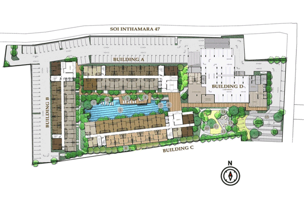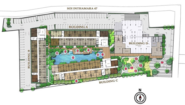 อาคาร A, อาคาร C และอาคาร D วางแนวอาคารให้ห้องพักอาศัยส่วนใหญ่หันหน้าเข้าหาทิศเหนือ ทิศใต้ ซึ่งมีข้อดีในเรื่องของทิศทางลม และแดด โดยห้องทางทิศใต้จะได้ลมค่อนข้างดี ส่วนห้องทางทิศเหนือก็ไม่โดนแดดมากจนเกินไป ส่วนอาคาร B วางแนวอาคารให้ห้องพักอาศัยหันหน้าไปทางทิศตะวันออก และทิศตะวันตก โดยที่ชั้น 1 ของอาคาร C ทั้งหมดจะเป็นห้องแบบ Pool Access สามารถเดินลงไปยังสระว่ายน้ำได้จากระเบียงห้องเลย แต่ก็แลกมากับเสียงรบกวนกรณีที่มีคนมาใช้บริการที่สระว่ายน้ำ