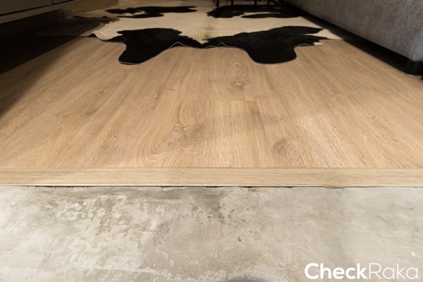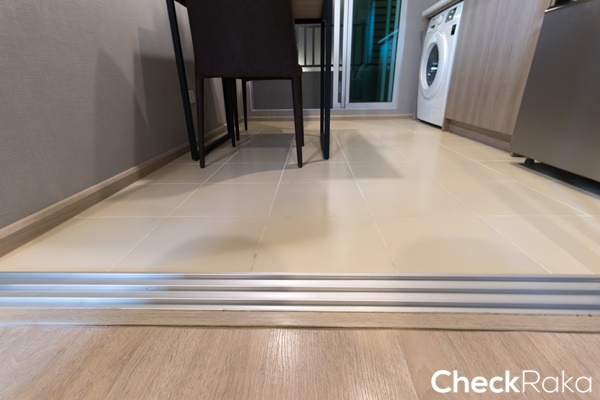 พื้นห้องปูด้วยไม้ลามิเนตสำเร็จรูปหนา 8 มม. ทางเข้าประตูจบด้วยลามิเนตสีเดียวกับพื้น
