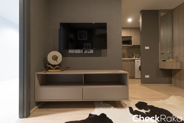 ฝั่งตรงข้ามโซฟาได้ชั้นวางทีวี Built-in มีระยะดูทีวีอยู่ที่ประมาณ 1.6 เมตร