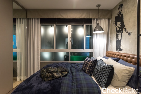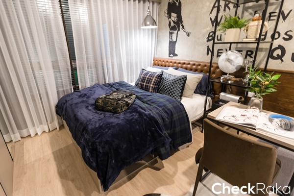 ห้องนี้วางเตียงนอนไว้ชิดผนังพื้นที่เตียงถึงตู้เสื้อผ้ากว้างประมาณ 90 ซม.