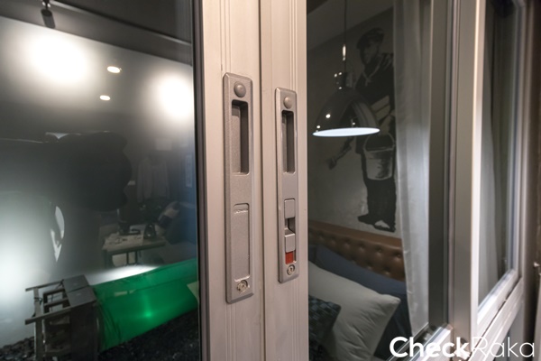หน้าต่างด้านล่างเป็นบานติดตาย ด้านบนเป็นบานเลื่อน โดยเปิดจากตรงกลางไปด้านข้าง