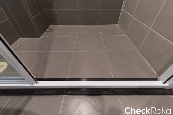 พื้นห้องน้ำปูด้วยกระเบื้องสีเทาเข้มขนาด 30x30 ซม.