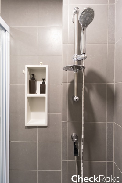 เจาะผนังไว้สำหรับวางแชมพูสบู่ได้ นอกจากนี้ยังได้ที่วางสบู่ทรงกลมอีก 1 อัน