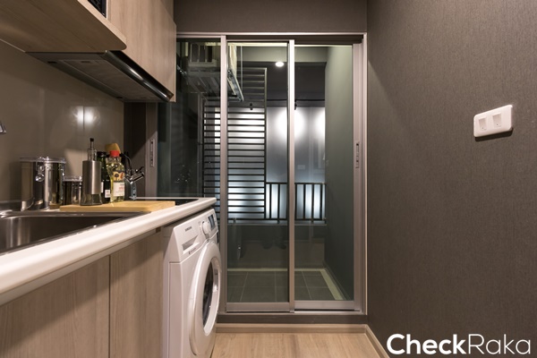 ห้องครัวอยู่ติดกับระเบียง ข้อดีคือเวลาทำอาหารเปิดประตูไว้เพื่อช่วยในการระบายกลิ่นอาหารได้ดี