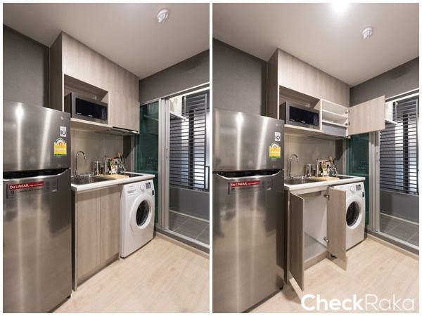 ห้องนี้ได้ครัวเปิดแบบ L-Shape ได้พื้นที่เก็บของเพิ่มมากขึ้นมาอีกหน่อย