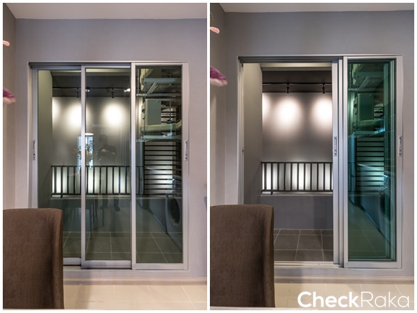 ห้องนี้ได้ครัวปิดกั้นเป็นสัดส่วนด้วยประตูบานเลื่อน 3 ตอนกรอบอลูมิเนียมสีธรรมชาติ ข้อดีคือเปิดได้กว้างเดินสะดวก