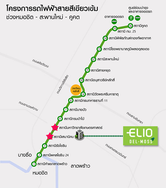 การเดินทางโดยรถไฟฟ้าก็ถือว่าสะดวกเช่นกันเพราะอยู่ใกล้กับส่วนต่อขยายรถไฟฟ้า BTS สายสีเขียว โดยสถานีที่ใกล้ที่สุดคือ "เสนานิคม" อยู่บริเวณปากซอยพหลโยธิน 34 อยู่ห่างจากโครงการประมาณ 1.2 กม. และอีกสถานีนึงที่อยู่ใกล้กับโครงการคือ "สถานีมหาวิทยาลัยเกษตรศาสตร์" อยู่ห่างจากโครงการ 1.2 กม. เช่นกัน โดยส่วนต่อขยายรถไฟฟ้าสายสีเขียวมีกำหนดแล้วเสร็จประมาณปี 2563 ซึ่งทางโครงการมีรถ Shuttle Bus ไว้คอยบริการรับส่งลูกบ้านไปยังสถานีรถไฟฟ้าอีกด้วยนะคะ และจาก BTS เสนานิคมนั่งไปอีกเพียง 3 สถานีก็จะถึง MRT สถานีพหลโยธินแล้ว