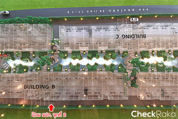 ไม้กระดกและป้อม รปภ. จุดที่ 2 อยู่บริเวณสีเทาอ่อน ป้องกันไม่ได้ให้บุคคลภายนอกผ่านเข้ามาภายในตัวโครงการ