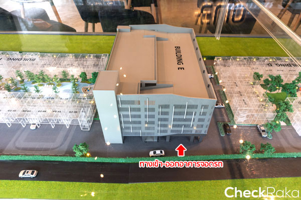 ทางขึ้นอาคารจอดรถจะอยู่ทางฝั่งทิศเหนือของอาคาร E