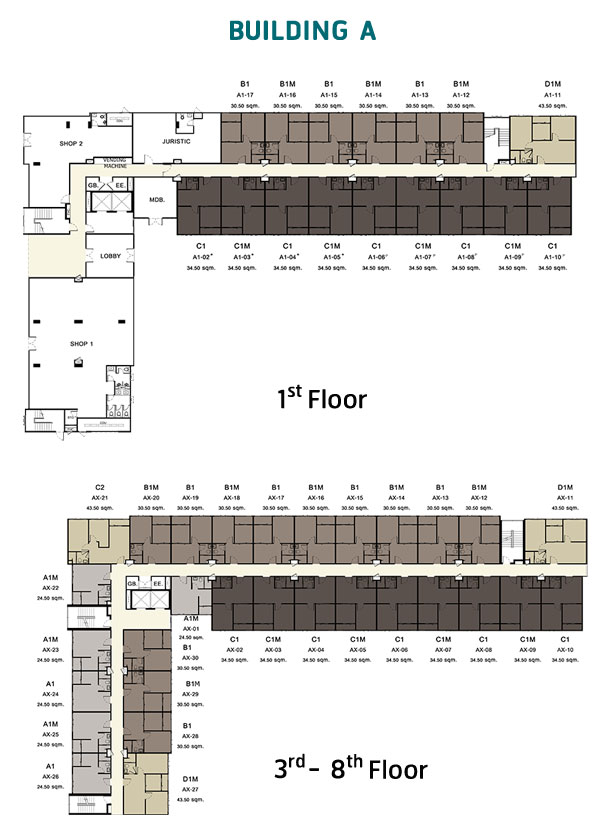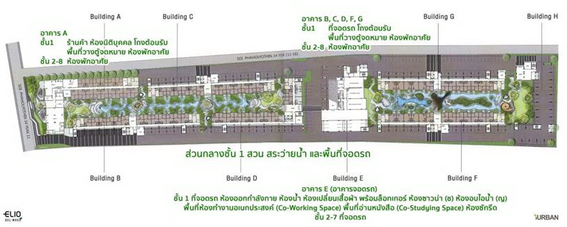 ภาพ Master Plan ภาพรวมบริเวณชั้น 1 ของโครงการ (คลิกดูภาพขนาดใหญ่) Master อาคาร A : อาคารพักอาศัยรูปทรงตัว L สูง 8 ชั้น มีห้องพักอาศัยทั้งหมด 224 ยูนิต ประกอบด้วย
