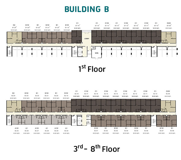 Master อาคาร B : อาคารพักอาศัยรูปทรงตัว I สูง 8 ชั้น มีห้องพักอาศัยทั้งหมด 224 ยูนิต ประกอบด้วย