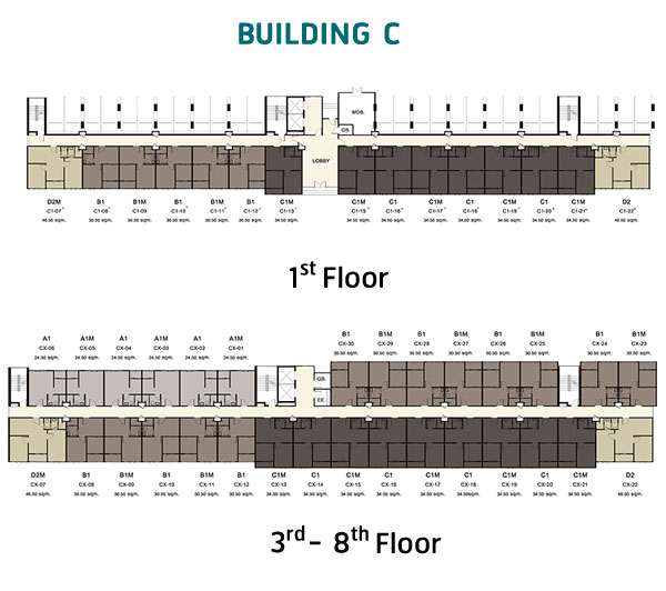 Master อาคาร C : อาคารพักอาศัยรูปทรงตัว I สูง 8 ชั้น มีห้องพักอาศัยทั้งหมด 224 ยูนิต ประกอบด้วย