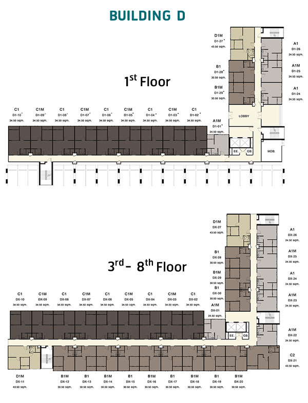 Master อาคาร D : อาคารพักอาศัยรูปทรงตัว L สูง 8 ชั้น มีห้องพักอาศัยทั้งหมด 224 ยูนิต ประกอบด้วย