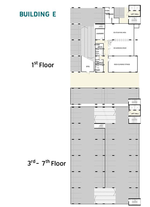 Master อาคาร E : อาคารจอดรถและพื้นที่ส่วนกลางรูปทรง I สูง 7 ชั้น ประกอบด้วย