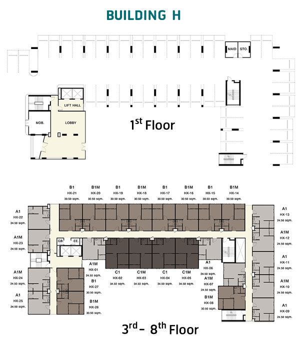 Master อาคาร H : อาคารพักอาศัยรูปทรงตัว C สูง 8 ชั้น มีห้องพักอาศัยทั้งหมด 188 ยูนิต ประกอบด้วย