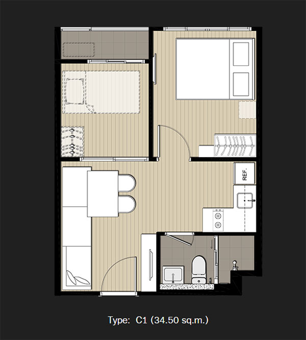- ภาพห้องตัวอย่างแบบ 1 Bedroom Plus ขนาด 34.50 ตร.ม.