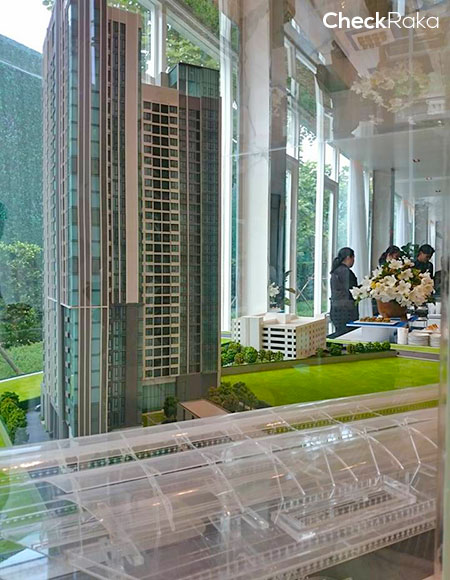 โมเดลโครงการ ตัวตึกคล้ายตัว L มีอาคารจอดรถด้านหลัง