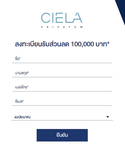 เซียล่า ศรีปทุม (CIELA Sripatum) เปิดจองอย่างเป็นทางการ 10 มี.ค. 2561 นี้ ผู้ที่สนใจสามารถลงทะเบียนเพื่อรับส่วนลดพิเศษ ตั้งแต่ 100,000 บ. สำหรับห้อง Studio ไปจนถึงส่วนลดพิเศษ 250,000 บ. สำหรับ 2 Bedroom