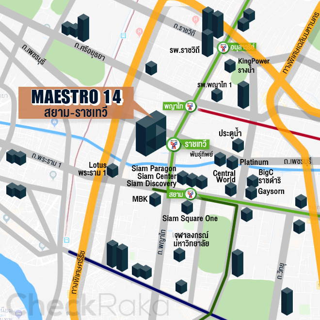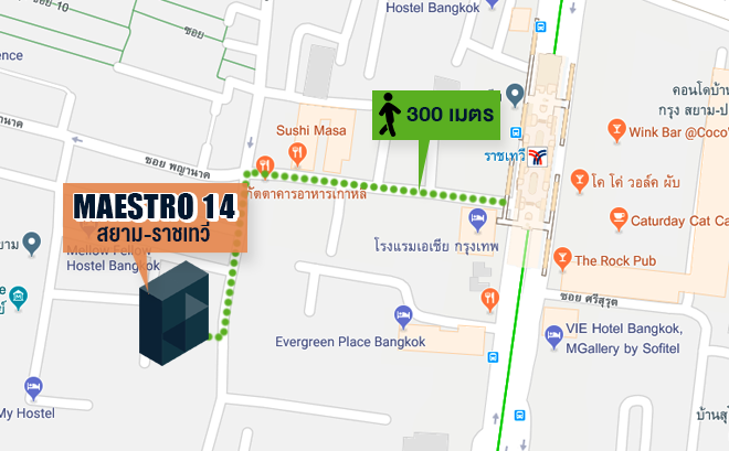 ถ้าพูดถึงทำเลที่ตั้งขอโครงการ "Maestro14 สยาม-ราชเทวี" ก็คงต้องบอกว่าเป็นทำเลที่สะดวกมาก สะดวกในที่นี้ของแต่ละคนอาจไม่เท่ากัน แต่ถ้ามองถึงชีวิตนักศึกษาจุฬาฯ การอยู่คอนโดนี้ก็จะไปเรียนได้สะดวก เพราะตอนที่ไปรีวิวก็มีผู้ปกครองมาดูห้องให้น้องๆ ที่เพิ่งสอบติดจุฬาฯ ระยะทางเดินประมาณ 1.5 กิโลเมตร หรือถ้าขับรถไปผ่านแยกปทุมวันก็ประมาณกิโลเมตรนิดๆ นับว่าชิลมากๆ เพราะอย่างนี้ไง เลยทำให้คอนโดนี้เป็นที่สนใจของผู้ปกครองและนักศึกษา รวมถึงคนที่อยากลงทุนไว้ปล่อยเช่าด้วย นอกจากมหาลัยชื่อดังแล้วโครงการนี้ยังตั้งอยู่ใกล้กับศูนย์การค้าระดับเอเชียอีกด้วย ทั้งสยามเซ็นเตอร์ สยามสแควร์วัน สยามพารากอน และ MBK ถัดจากนั้นก็มี เซ็นทรัลเวิลด์ บิ๊กซีราชดำริ ห้างเกษร เซ็นทรัลชิดลม รวมถึงเซ็นทรัลเอ็มบาสซี่ นอกจากนี้เดินทางด้วย BTS แค่ 2 สถานี ก็ถึงอนุสาวรีย์ชัยสมรภูมิที่เป็นแหล่งรวมโรงพยาบาลชั้นนำของกรุงเทพ