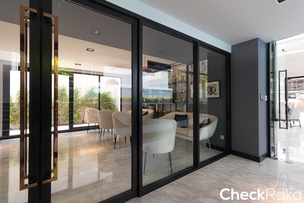 ห้องนั่งเล่นติดกับระเบียง ประตูแบบบานเลื่อน 2 ตอน