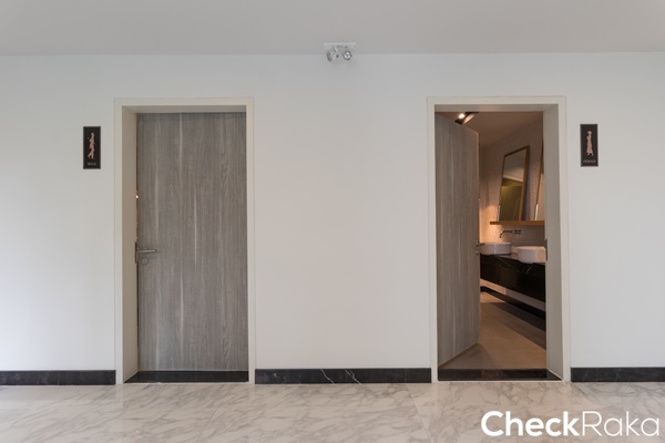 ประตูห้องน้ำมือจับลูกบิดทรงกลมมาตรฐาน พื้นที่ภายในห้องน้ำค่อนข้างกว้าง