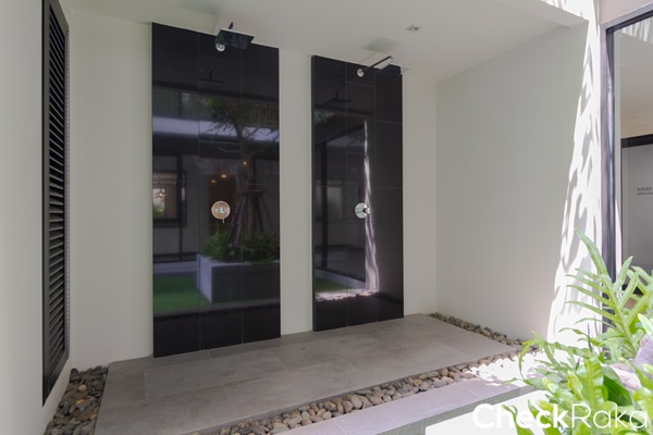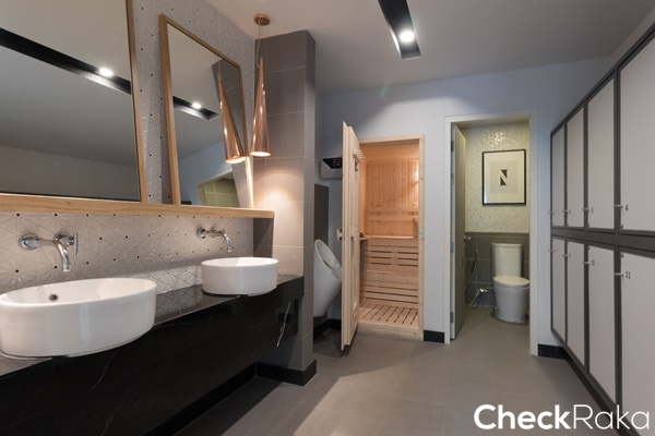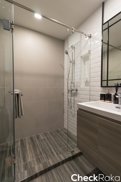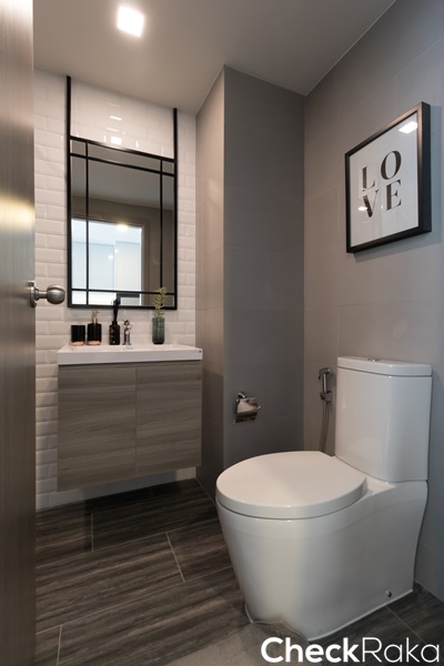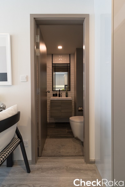 ตำแหน่งโถสุขภัณฑ์อยู่ทางซ้ายมือ อ่างล้างหน้าโซนกลาง และทางขวาเป็นฉากกั้นอาบน้ำ