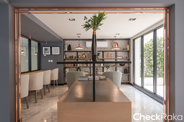พื้นปูด้วยกระเบื้องแกรนิตโต้ลายหินอ่อนโทนสีคล้ายไม้ทำให้ดูกลมกลืนกับลามิเนต
